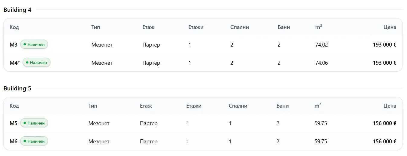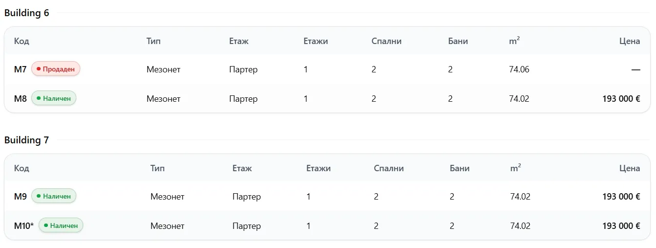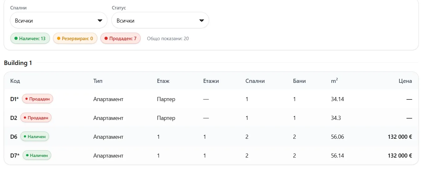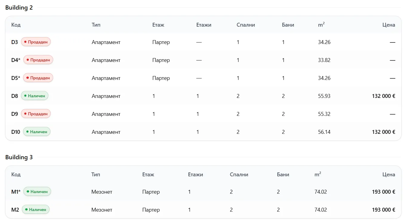Имотите са наименовани с текст М1, М2, М3, B1, B2, D1, D2 и т.н;