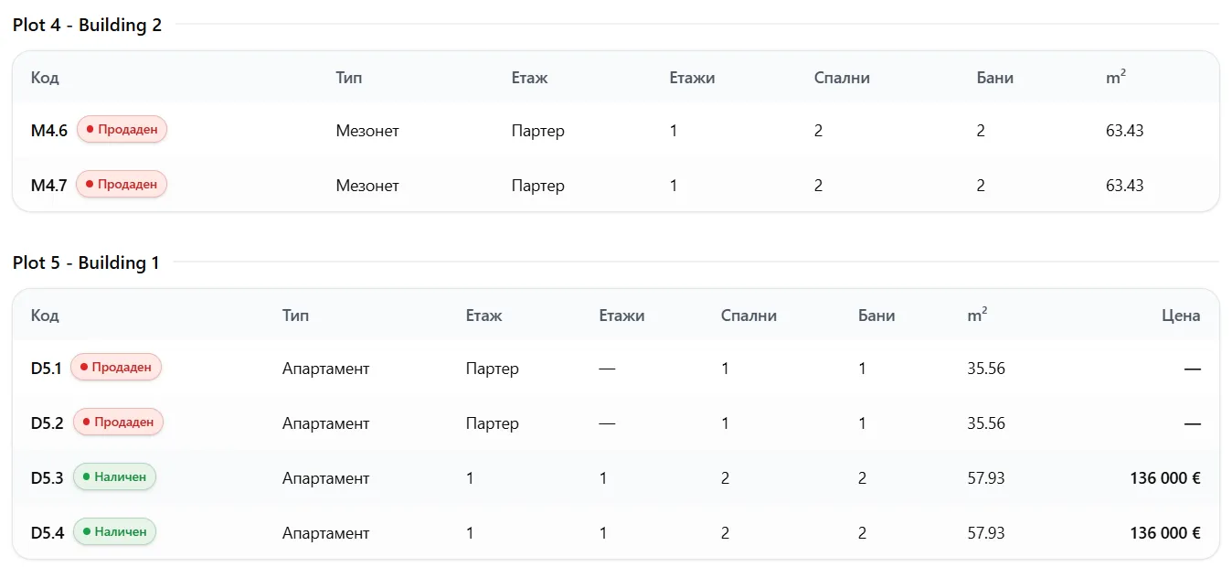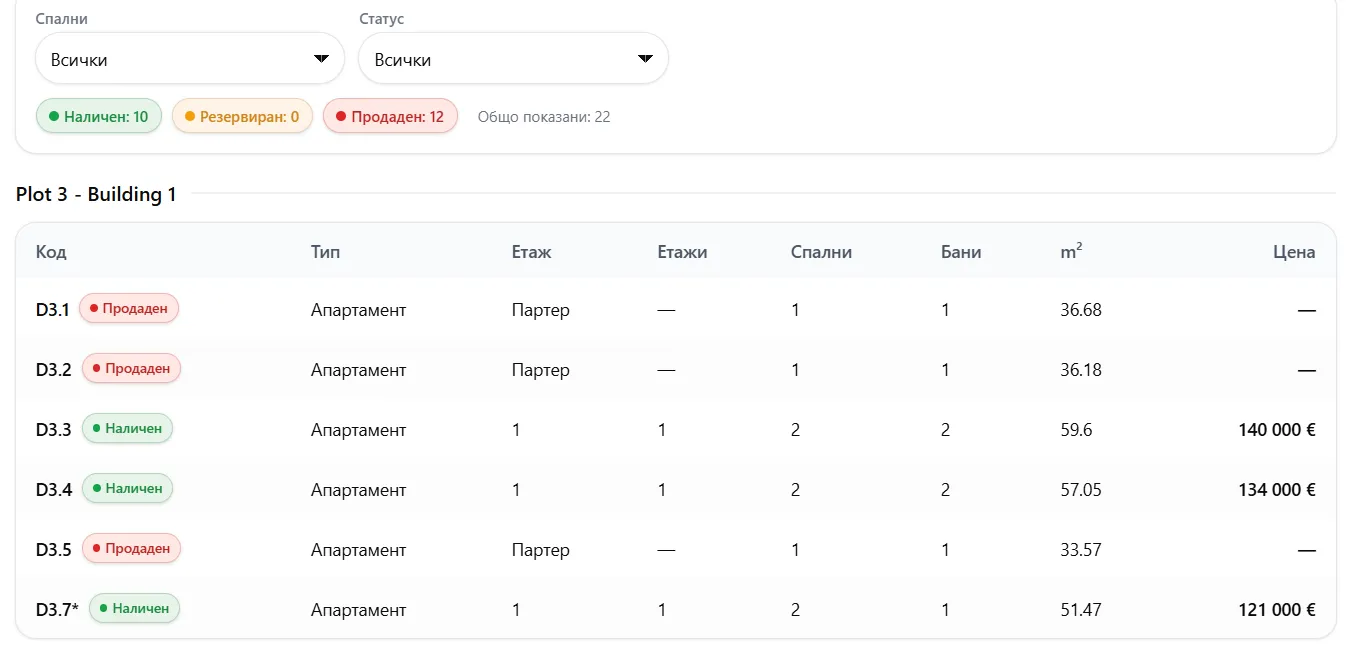 Имотите са наименовани с текст D3.1, D3.2, D3.3 и т.н;