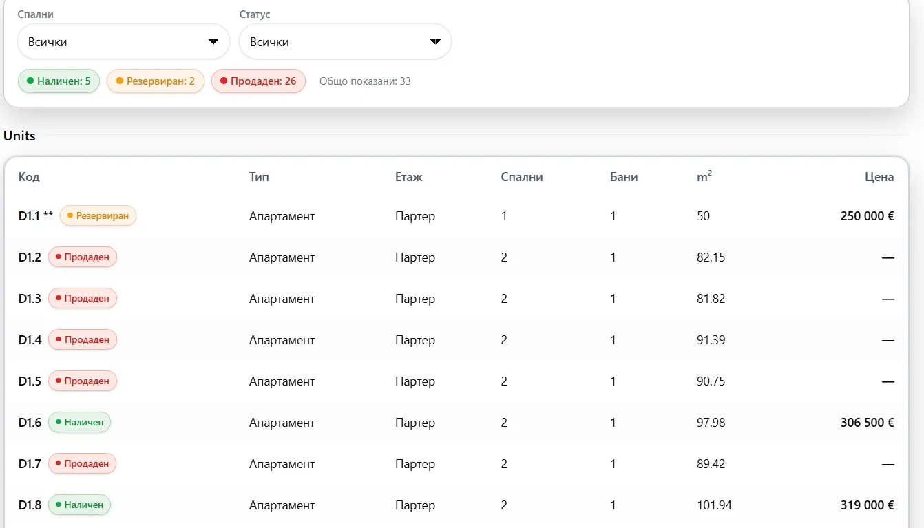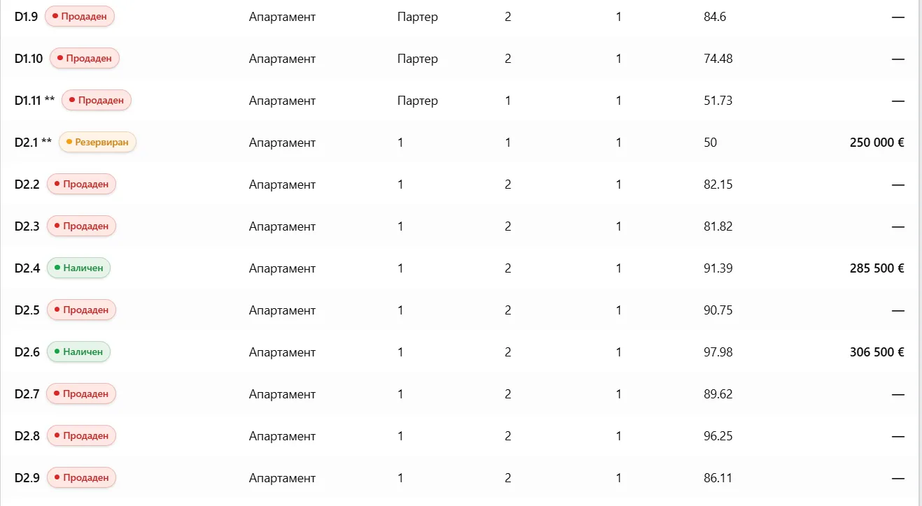 Имотите са наименовани с текст D4, D5, D8 и т.н;