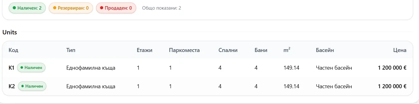 Имотите са наименовани с текст K1, K2, K3 и т.н;