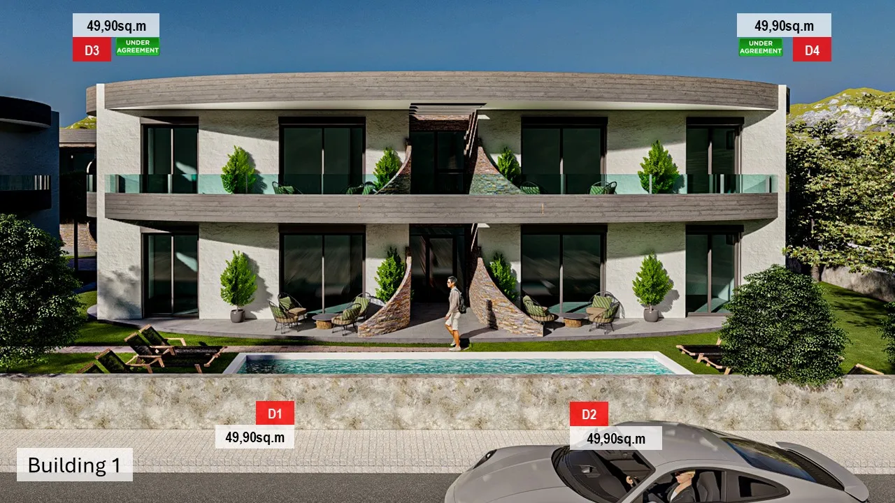 Същевременно екстериорът на комплекса е озеленен с общи басейни, тревни площи и дървета, което дава възможност на обитателите им да се наслаждават на прекрасни моменти на спокойствие и релакс с любимите си хора.