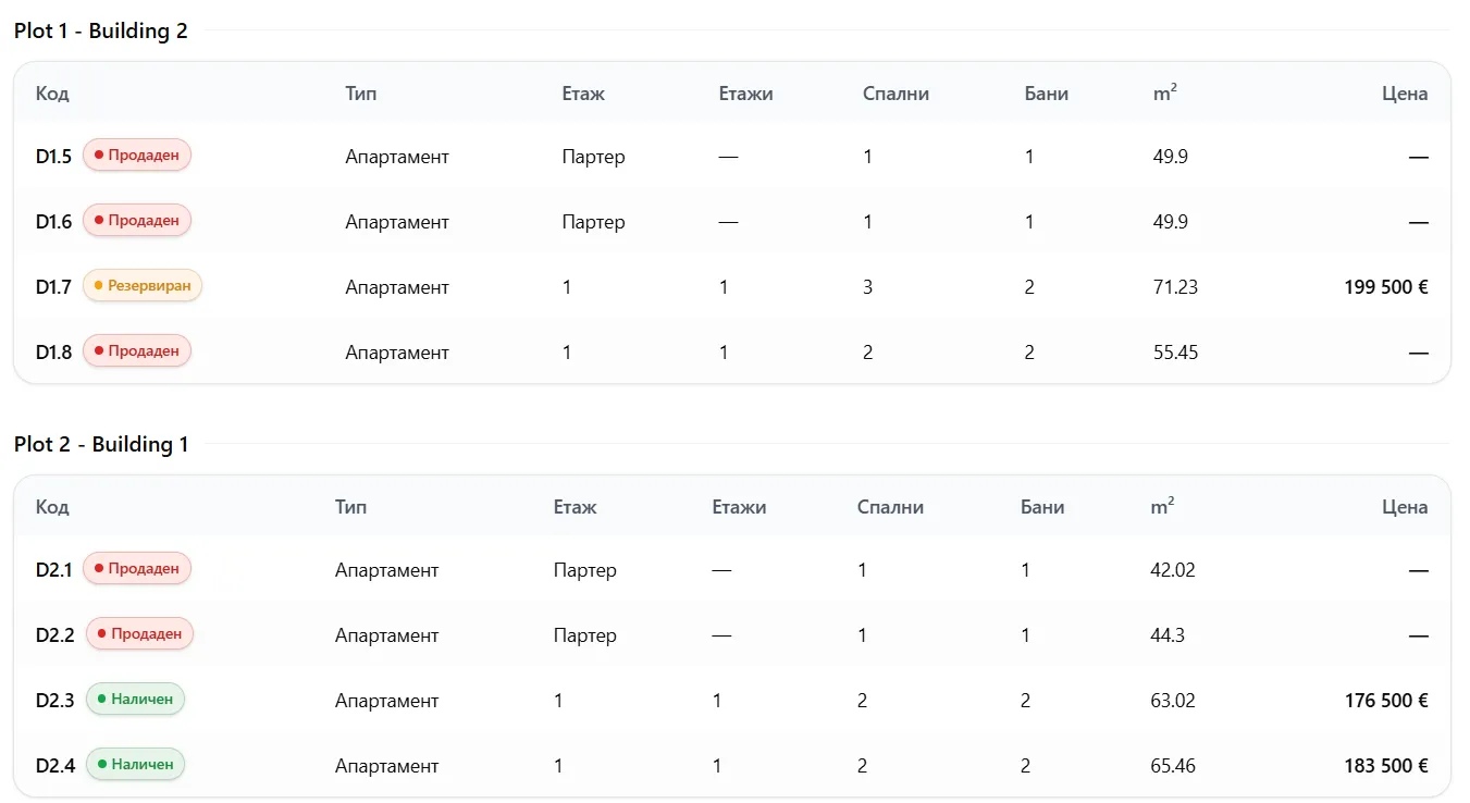 Имотите са наименовани с текст D4, D5, D8 и т.н;