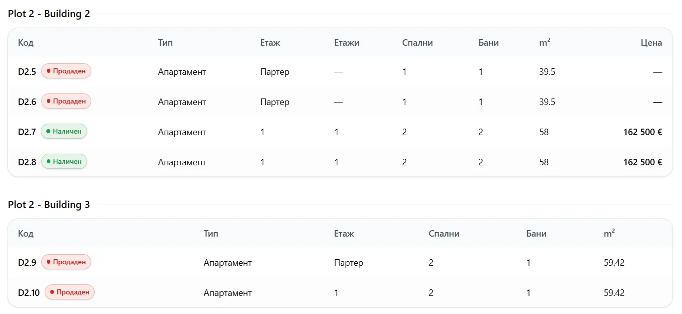 Маркираните с текст SOLD са продадени, останалите са свободни за покупка.