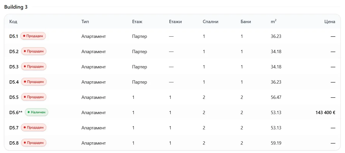 Имотите са наименовани с текст D4, D5, D8 и т.н;