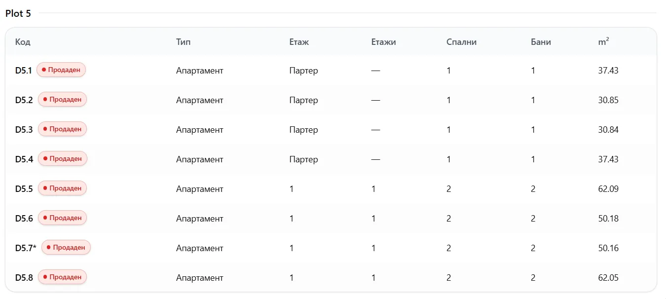 Имотите са наименовани с текст D4, D5, D8 и т.н;