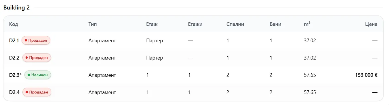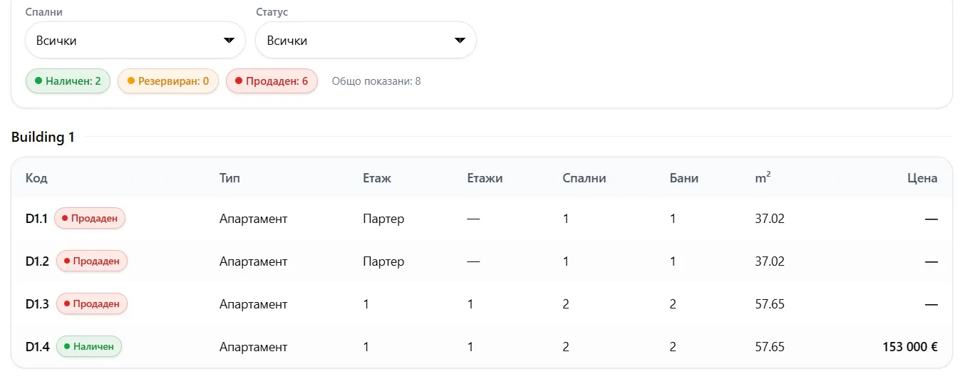 Имотите са наименовани с текст D4, D5, D8 и т.н;