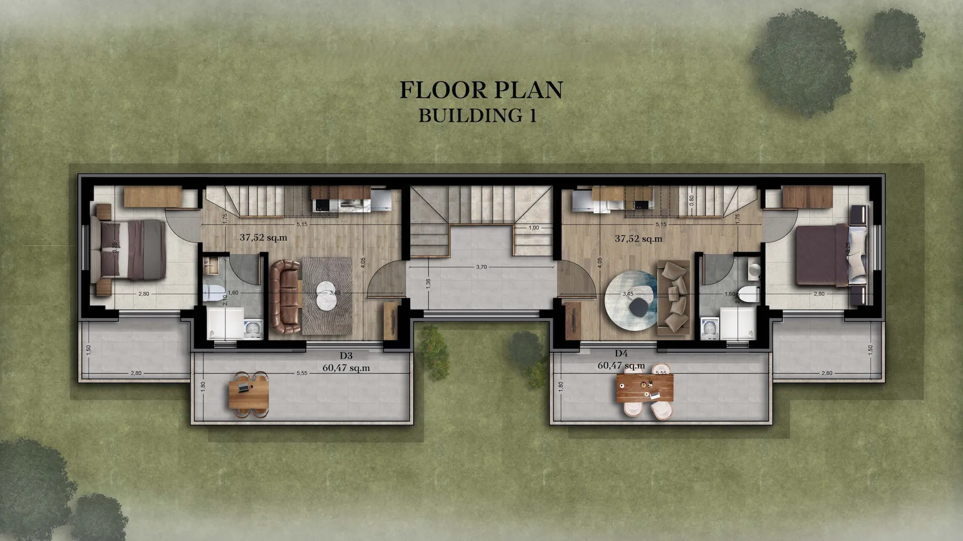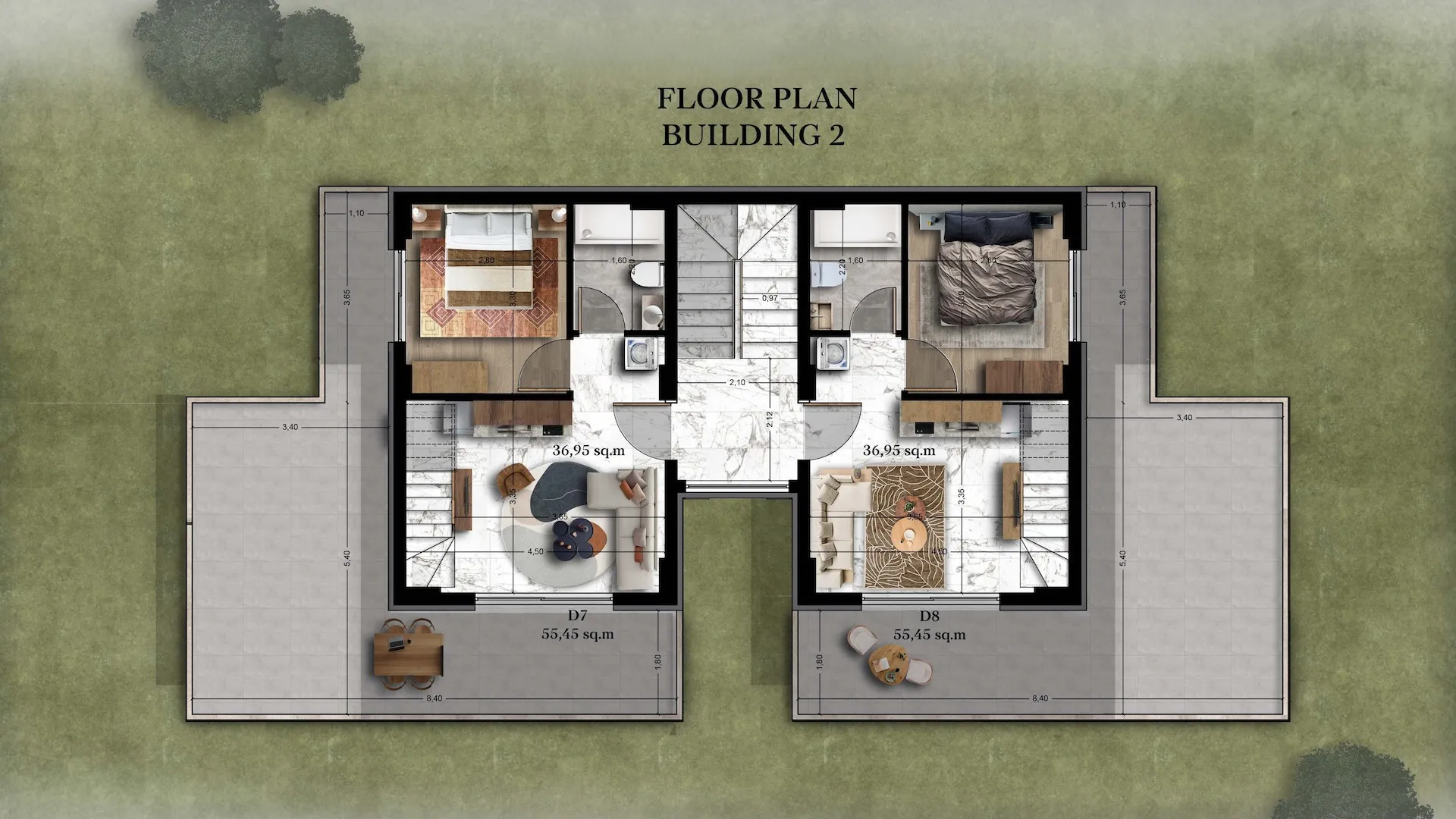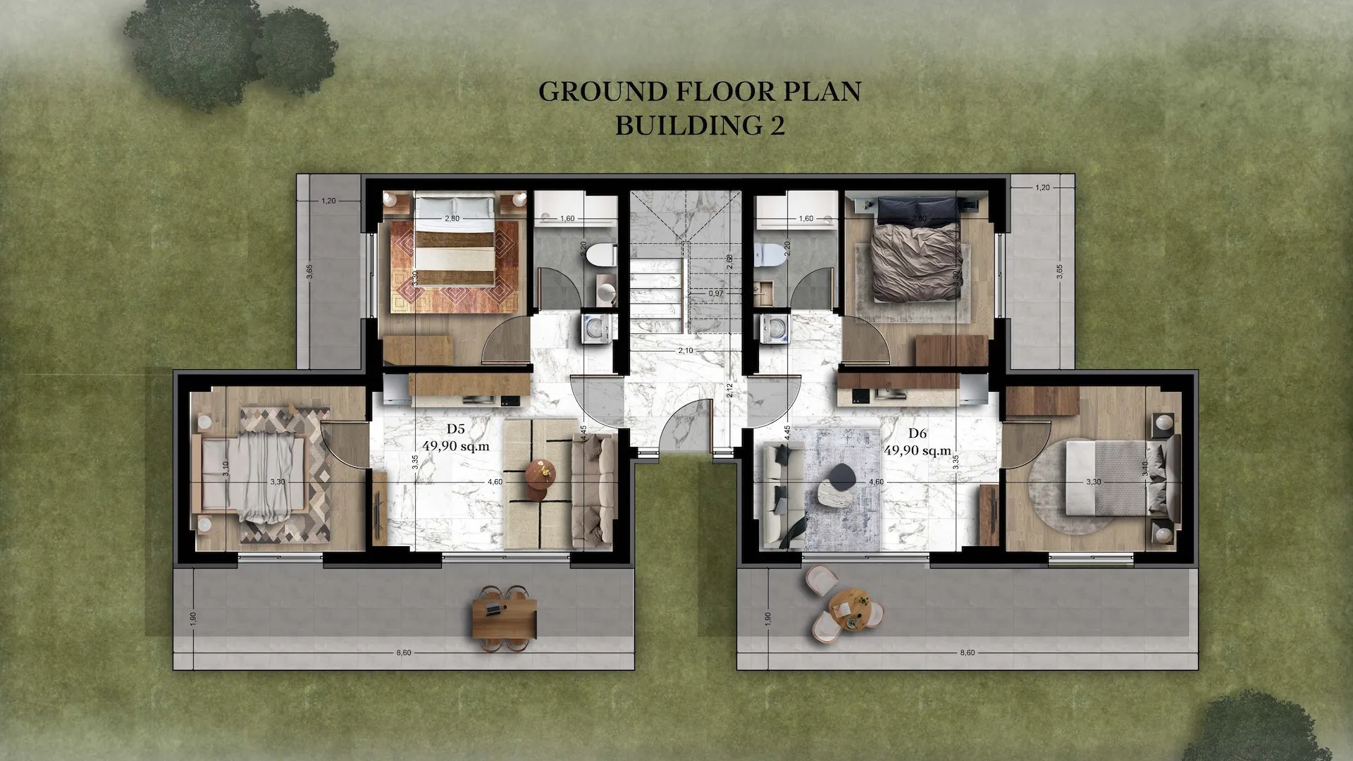 2 апартамента на партерния етаж с площ 55,57 кв.м