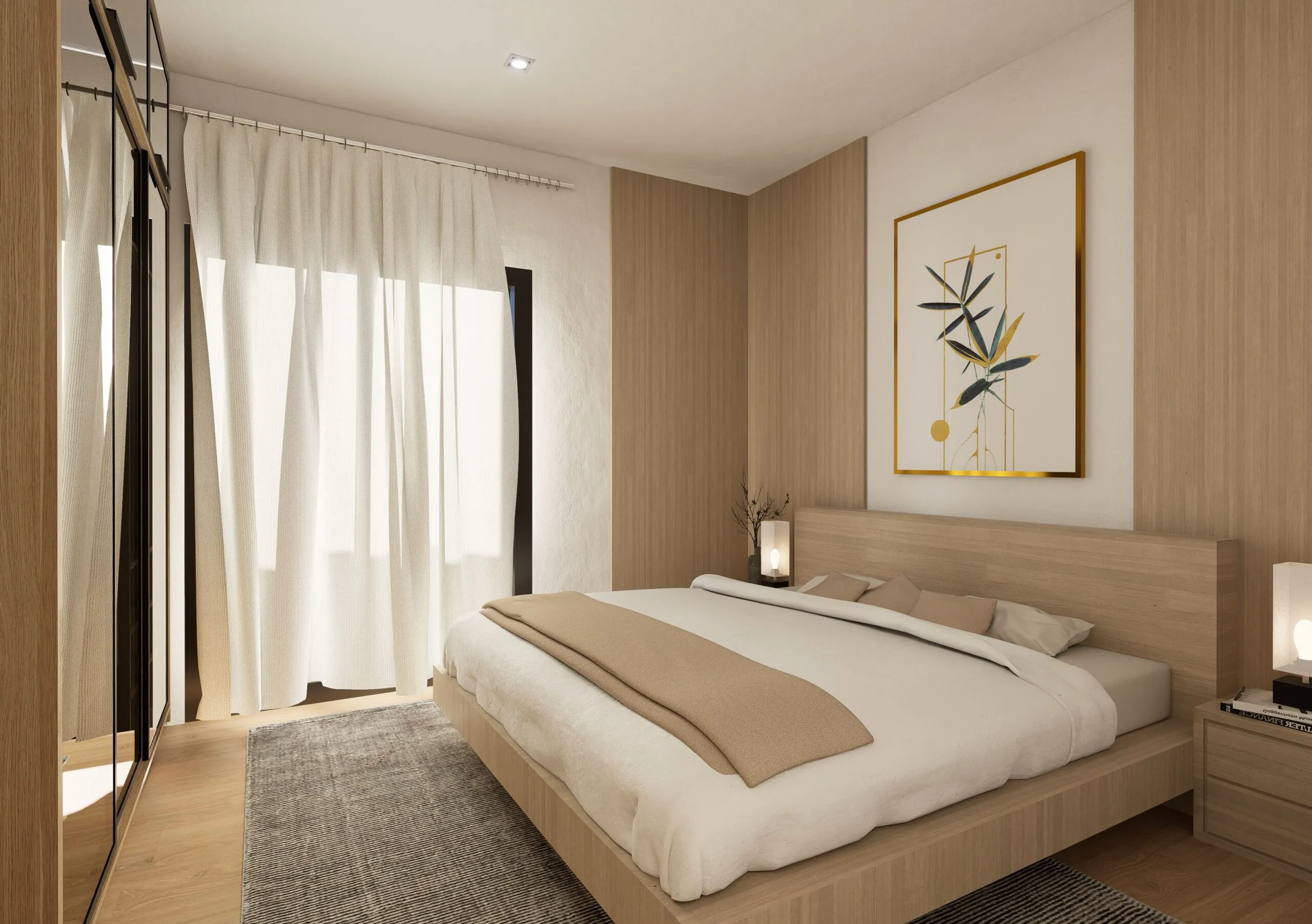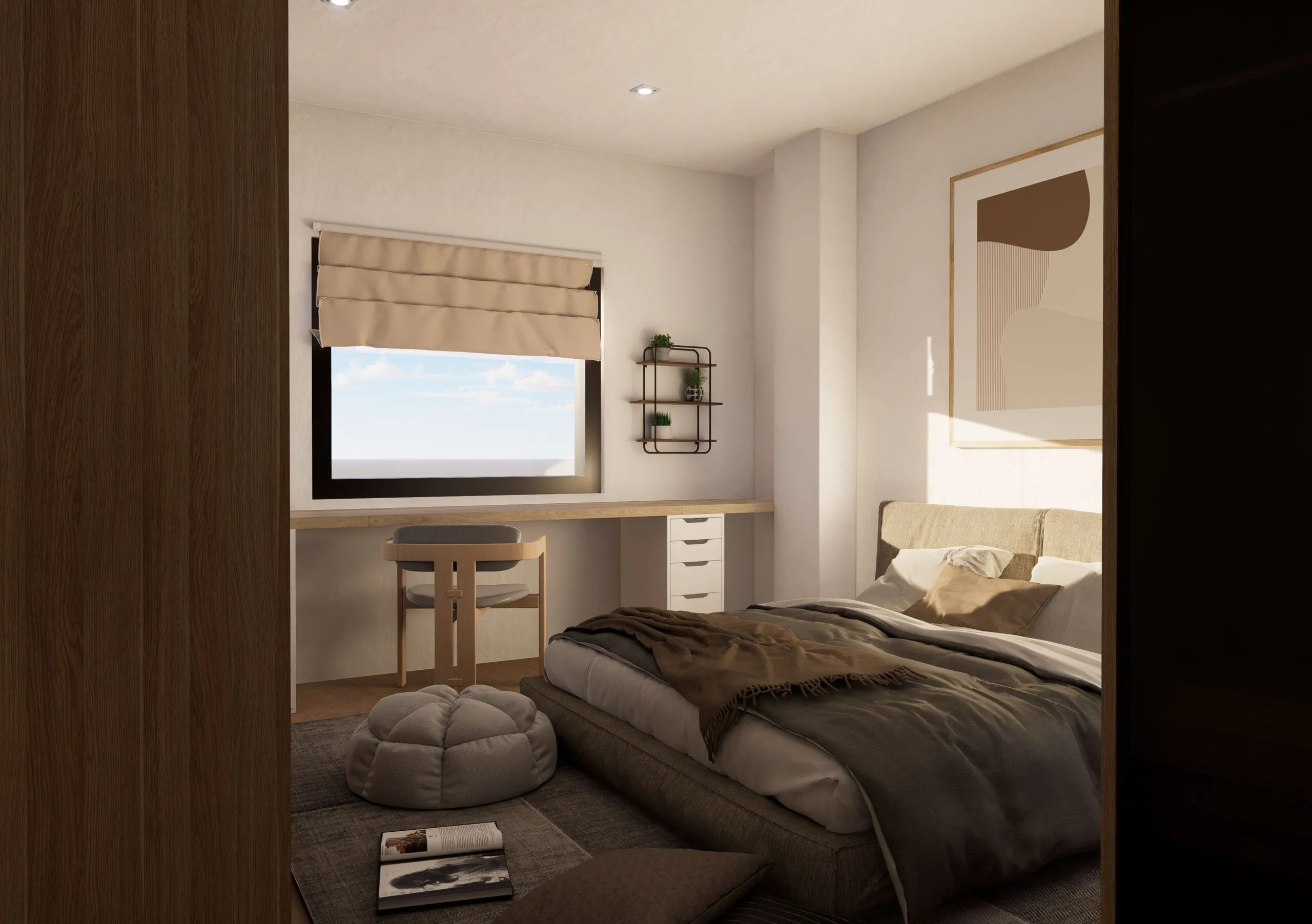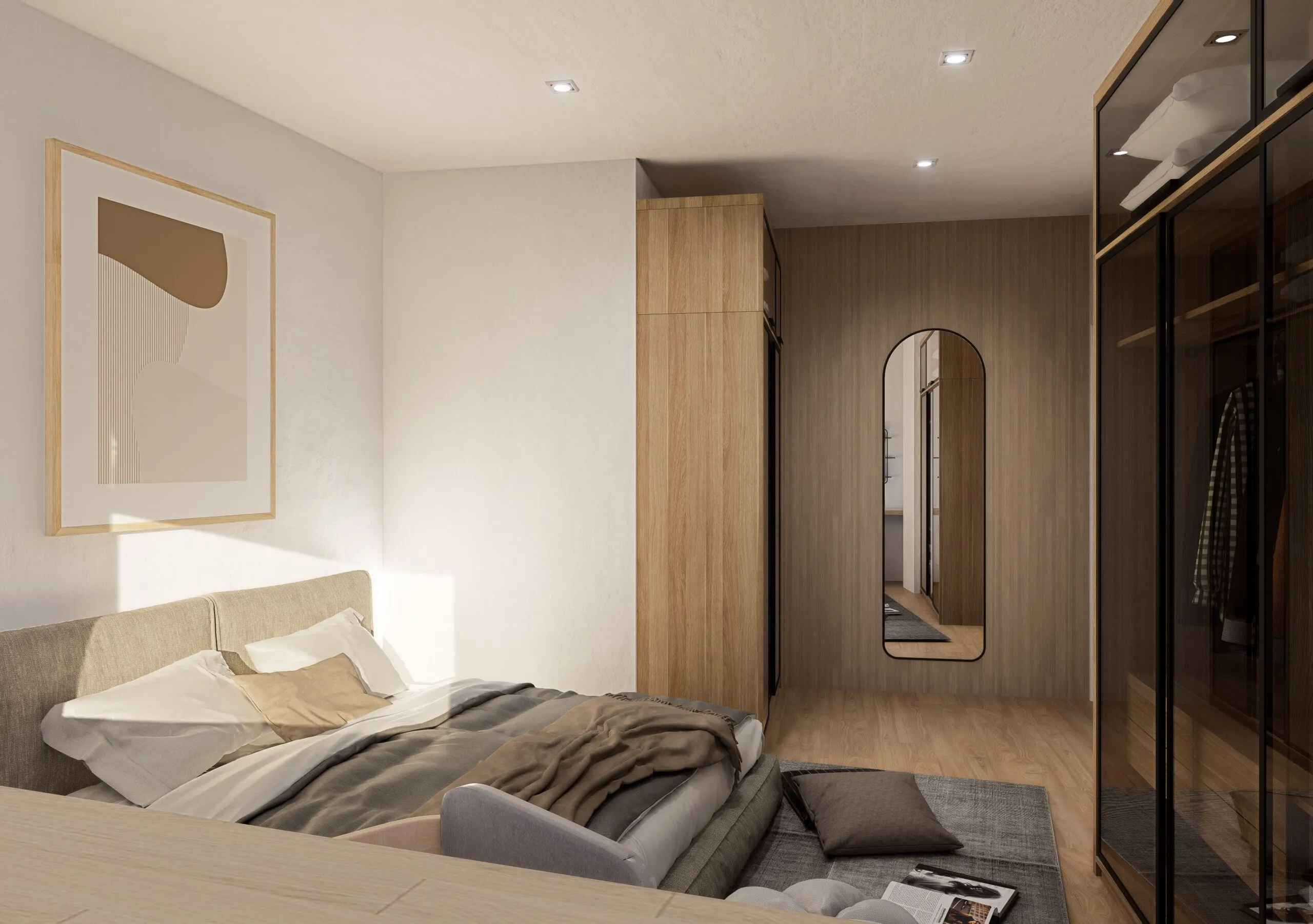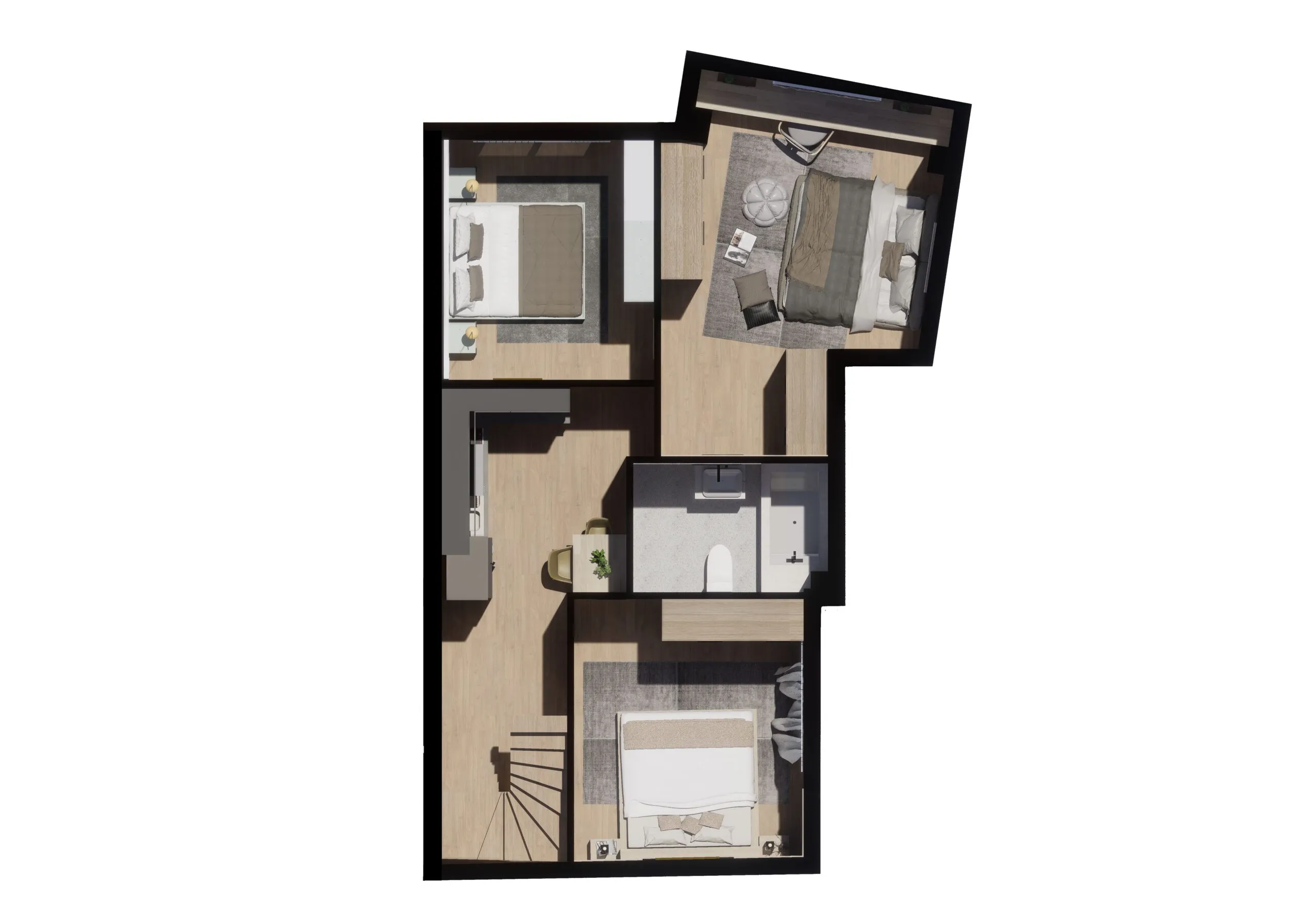 Състои се от 3 спални, кухня с хол, 2 бани.